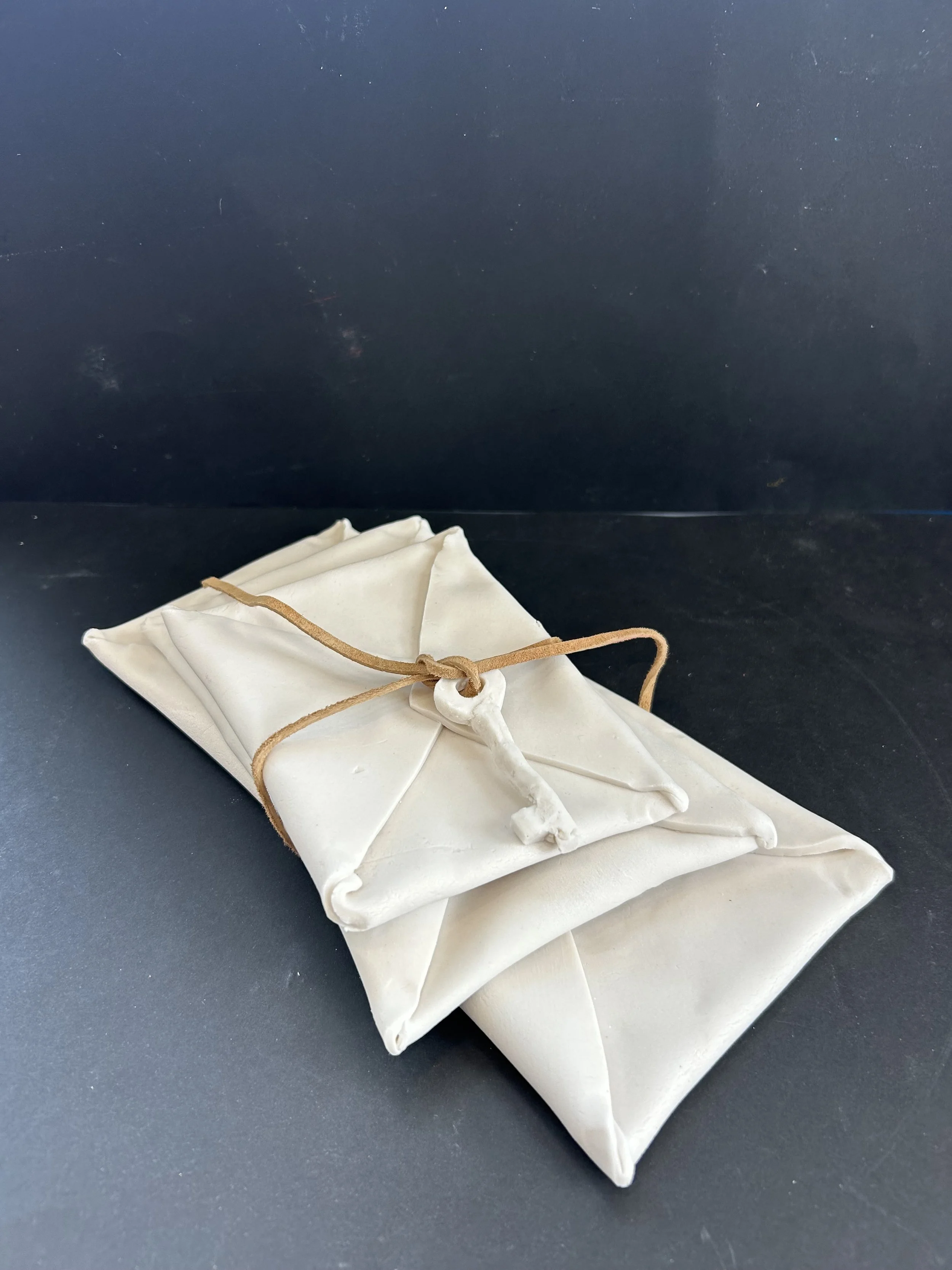 This month, Harrison Gallery will highlight more works by Frankie Slaughter. Symbolically, the porcelain envelopes, tied together with a leather cord and finished with a porcelain key, represent our connection to the world outside the comfort and privacy of home. Whether the letter inside is an invitation, promotion, rejection or personal message, the correspondence shapes our relationship and how we react to the people outside our private sphere. The porcelain key represents the locking (or unlocking) of those messages.